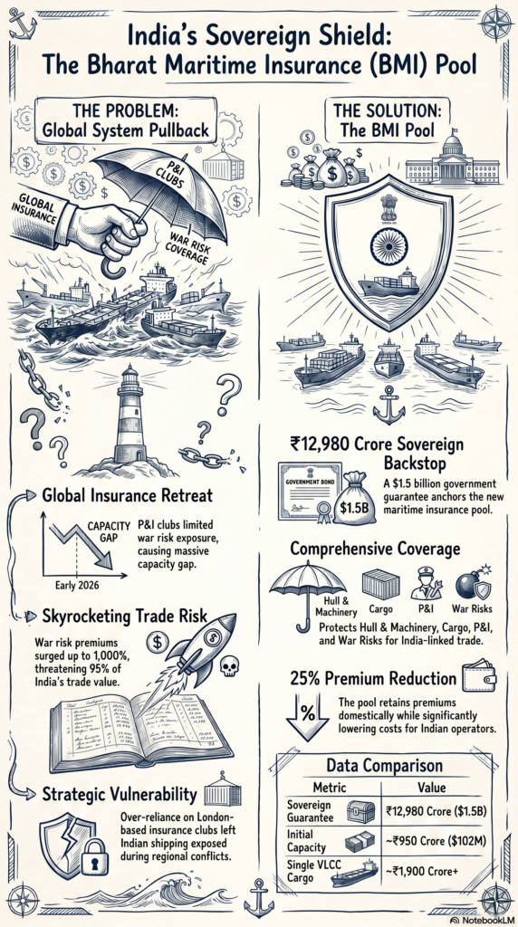 On April 18, 2026, the Union Cabinet approved the Bharat Maritime Insurance Pool (BMI Pool), backed by a ₹12,980 crore sovereign guarantee. It covers Hull &Machinery, Cargo, Protection & Indemnity (P&I), and War Risks for Indian-linked shipping.