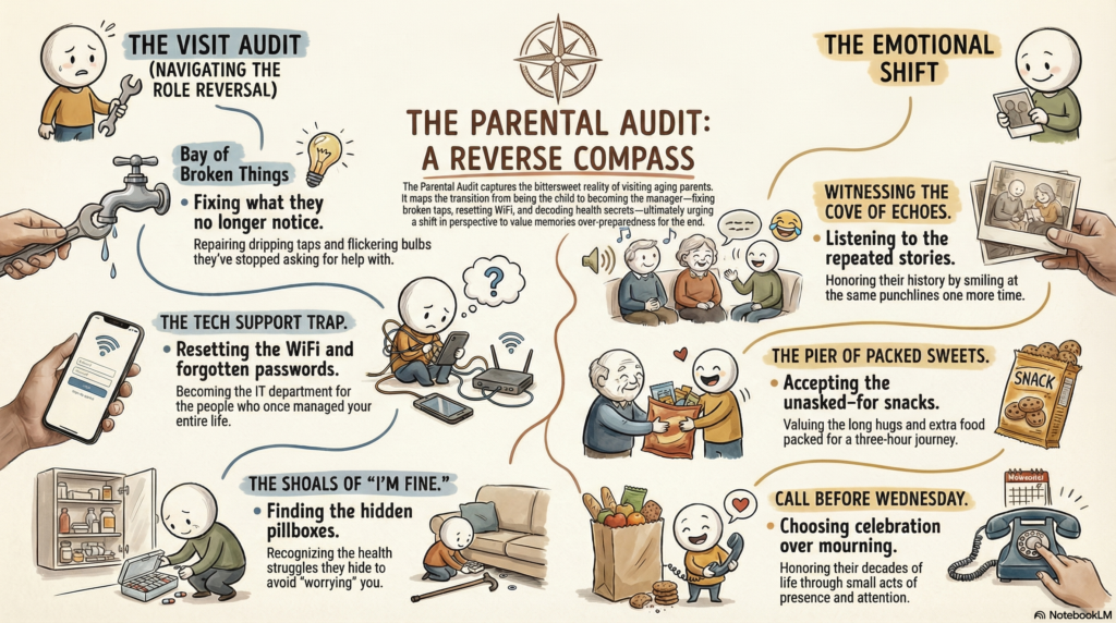 This is the reverse compass. The slow, unspoken role reversal. The day you realise you’re no longer the one being managed – you’re the one doing the managing. Your father, who once fixed everything with duct tape and attitude, now asks you how to restart the router. Your mother, who remembered every birthday of every cousin you’ve never met, now forgets where she put her glasses.